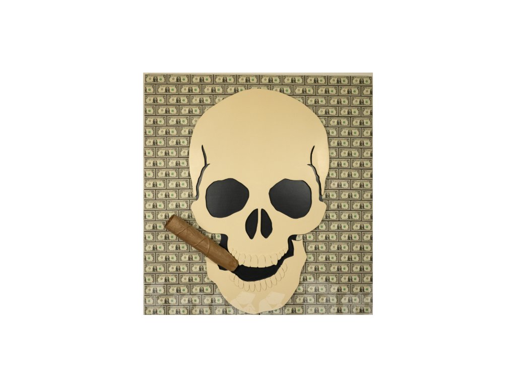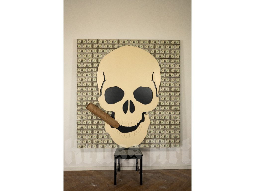 This isn’t just any skull – it’s a former financial guru who calculated everything… except the end of his cigar. The background made of real dollar bills symbolizes success, luxury, and that subtle paranoia that someone might snatch it all away.