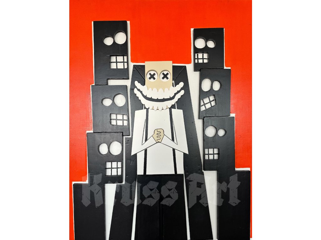 Layered extruded polystyrene, painted with acrylic and resin-based paints. Strong, graphic outlines. A comic-book feel with a punch of existential sarcasm.