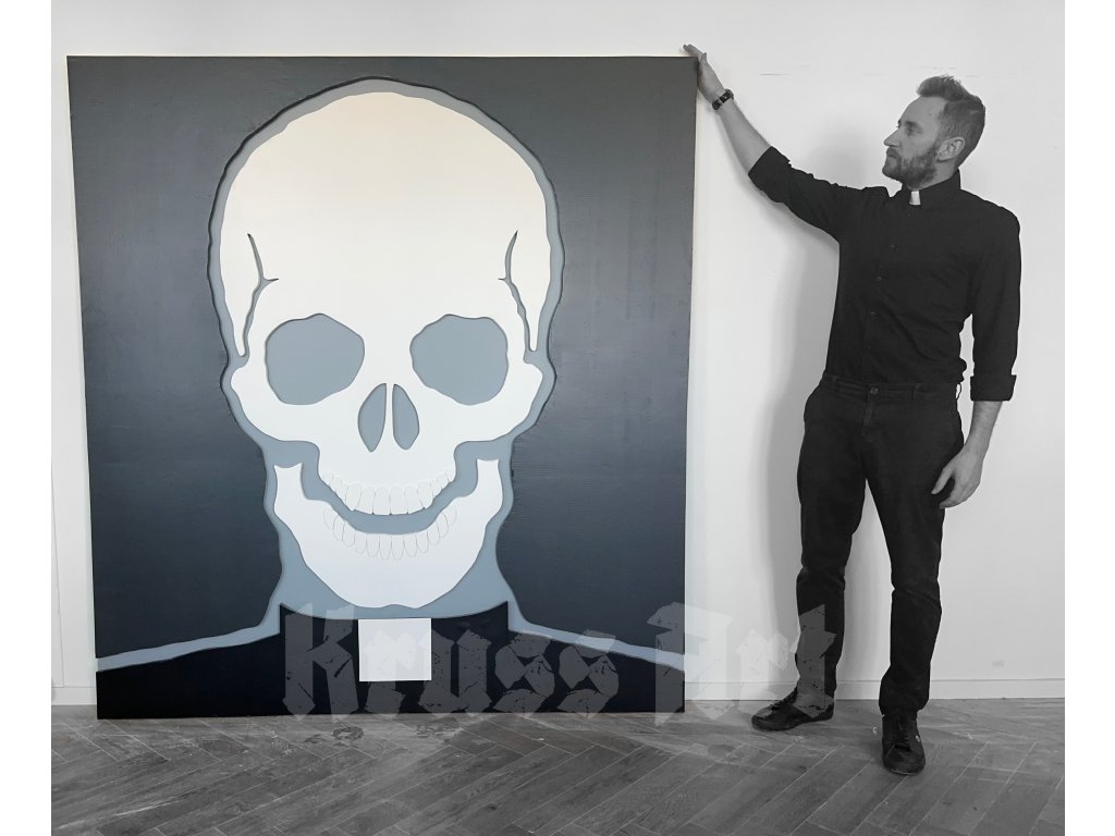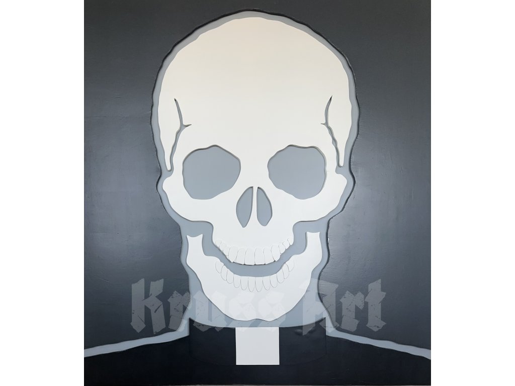 At first glance, it appears to be a portrait of a priest — yet instead of a face, we see a skull, a universal reminder that all are equal, regardless of worldly or spiritual power. The painting merges faith, humility, and mortality into one minimalist but striking contrast.