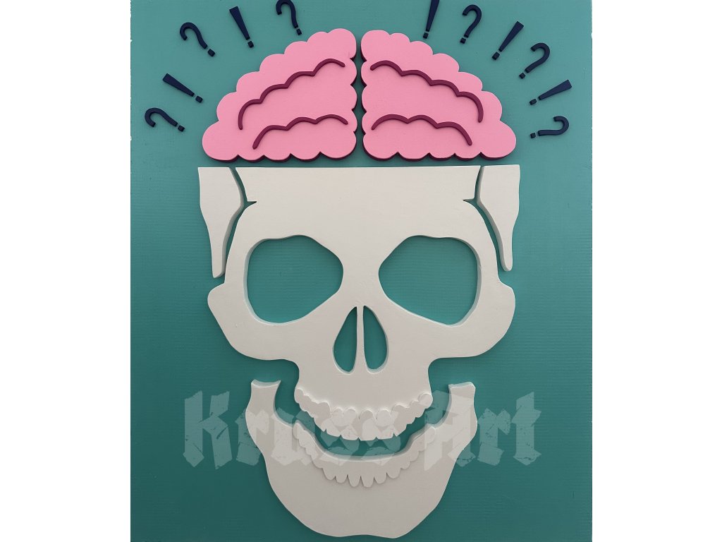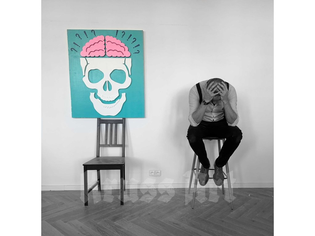 The white skull, pink brain, and a storm of question and exclamation marks above the head represent a state of mental overload, where questions arise and answers are generated automatically – uncontrollably, and to the point of exhaustion.